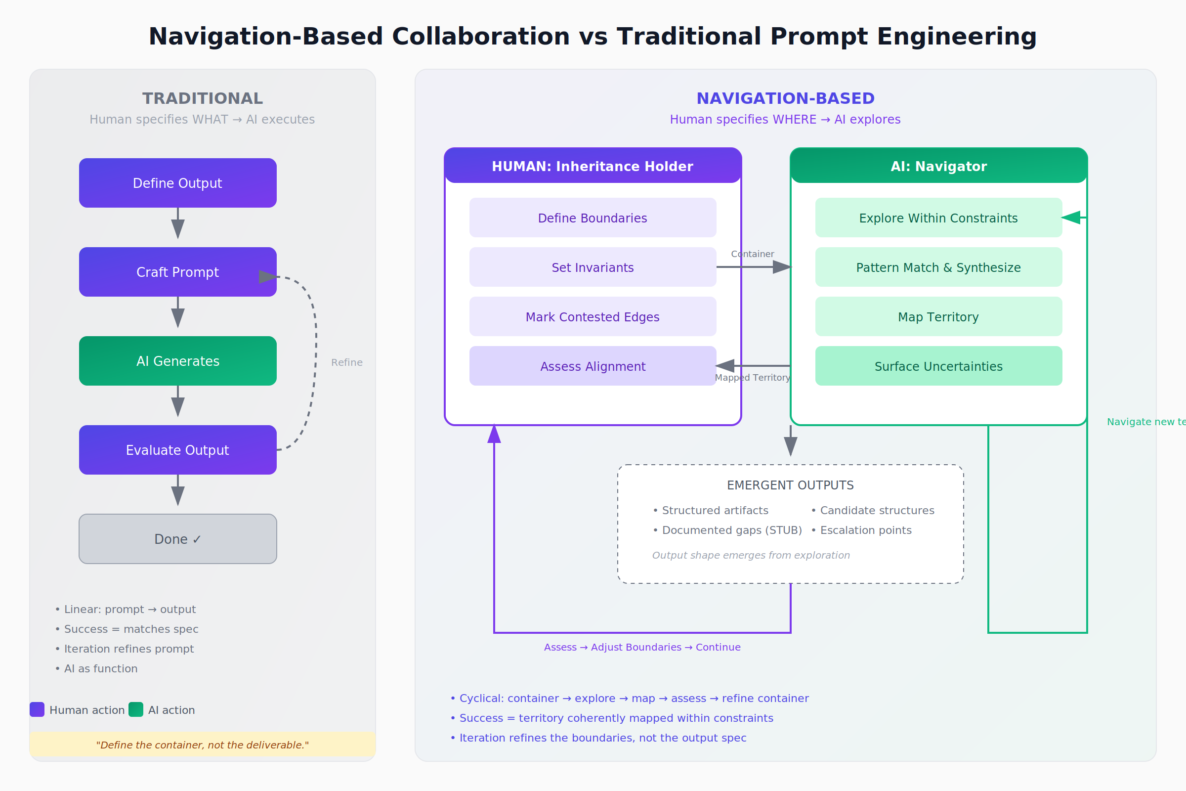 Front-load the encounter with deliberate reasoning over values. Invariants, boundaries, contested edges—before the AI executes. The human does the work first. The interface becomes a forcing function for human sovereignty.